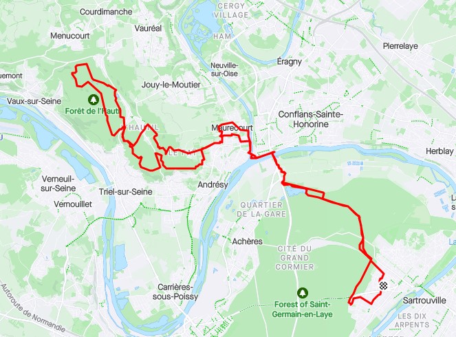 Magnifique soleil pour cette dernière sortie avant le we breton. Nous étions 13 au départ : Marc, Michel G, Dom, Alex, Benoit, Emma, Guy, Olivier, Philippe, Bruno, Vincent LA, Mayra, Vincent DE. Après une petite réparation sur le vélo de Bruno, nous partons vers le Parc de Marly puis Louveciennes, p...