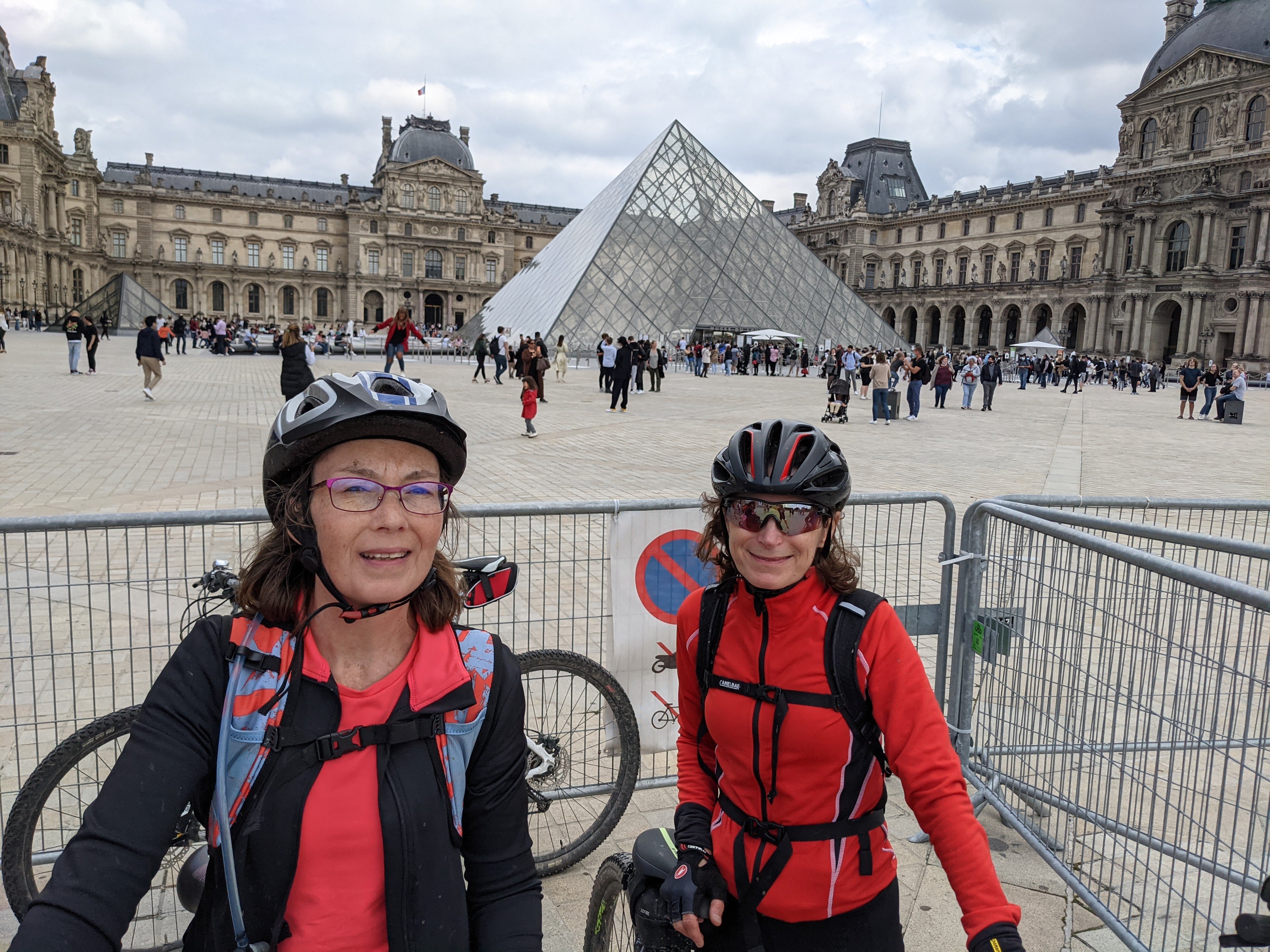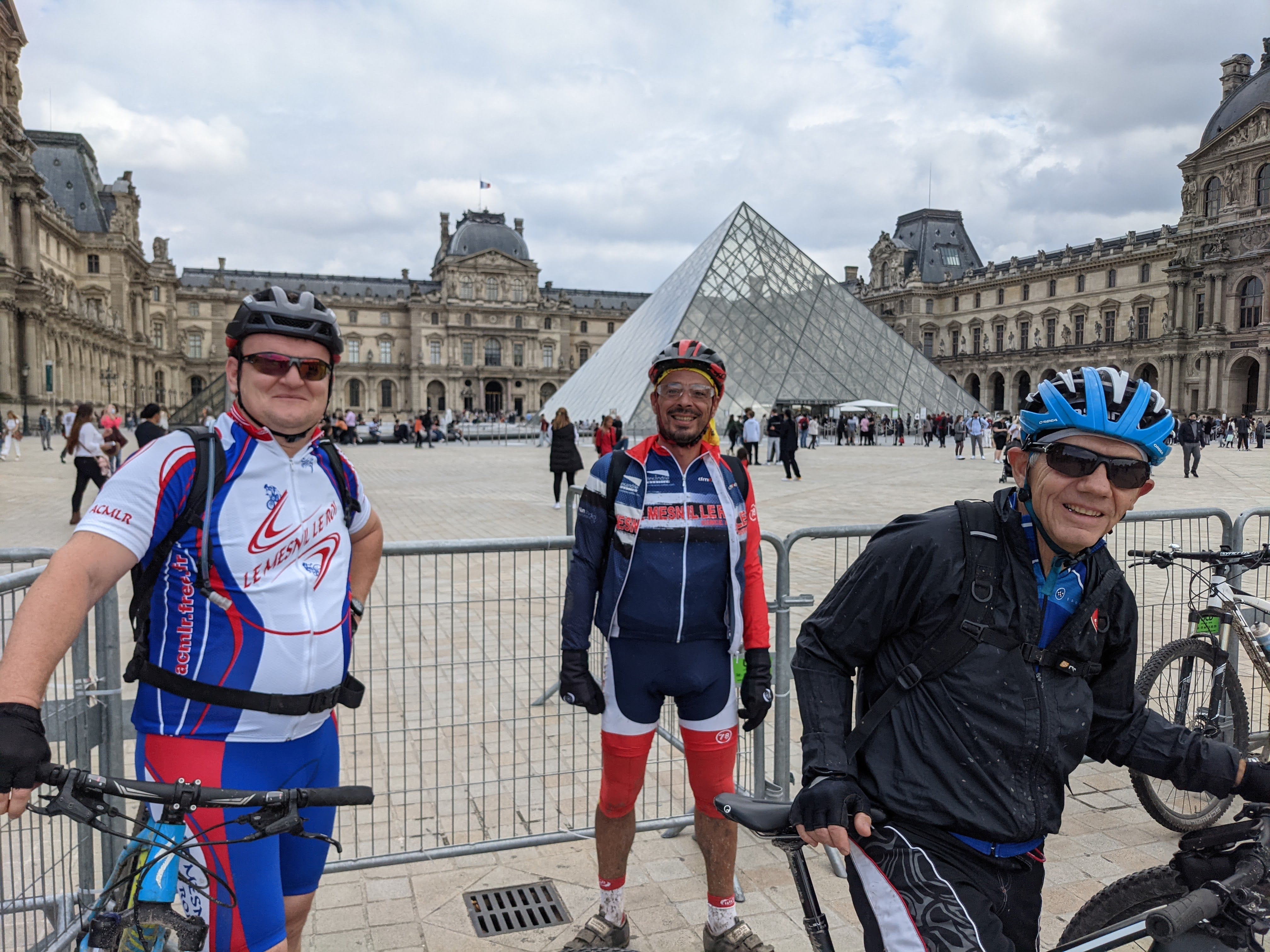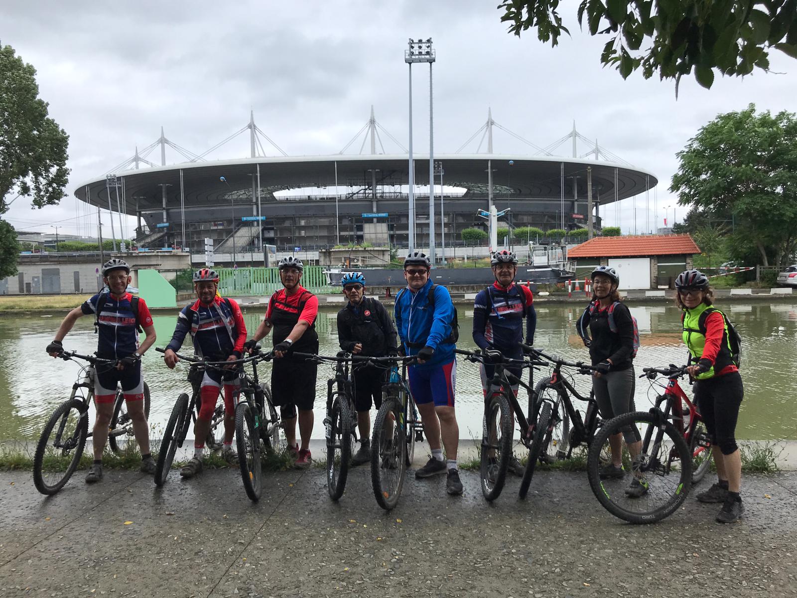 Jusque-là tout a semblé facile, nous piqueniquons dans le parc, pas embêtés par la foule en ce mercredi bien gris, mais sans pluie, après nos craintes vu le temps de la veille. Retour le long du canal jusqu'à Paris, à une allure soutenue, Marc menant la file indienne. Rentrée sur Paris le long du bassin de la Villette et du canal Saint-Martin. Pause bien méritée à la terrasse de l'Atmosphère (allusion à la réplique d'Arletty dans le film Hotel du Nord situé en face), puis nous poursuivons vers la Bastille, le port de l'Arsenal, puis les quais en côtoyant tous ces monuments emblématiques de Paris. Pause photo devant la pyramide du Louvre, et continuons via le bois de Boulogne pour rejoindre La Défense, où en cette année napoléonienne nous nous arrêtons devant le lieu où fut débarquée la dépouille du petit caporal. Nous récupérons les bords de Seine que nous longeons par la boucle de Bougival, la barre des 100 km atteintes commençant à se faire sentir … Retour au club via la forêt depuis le château du Val.