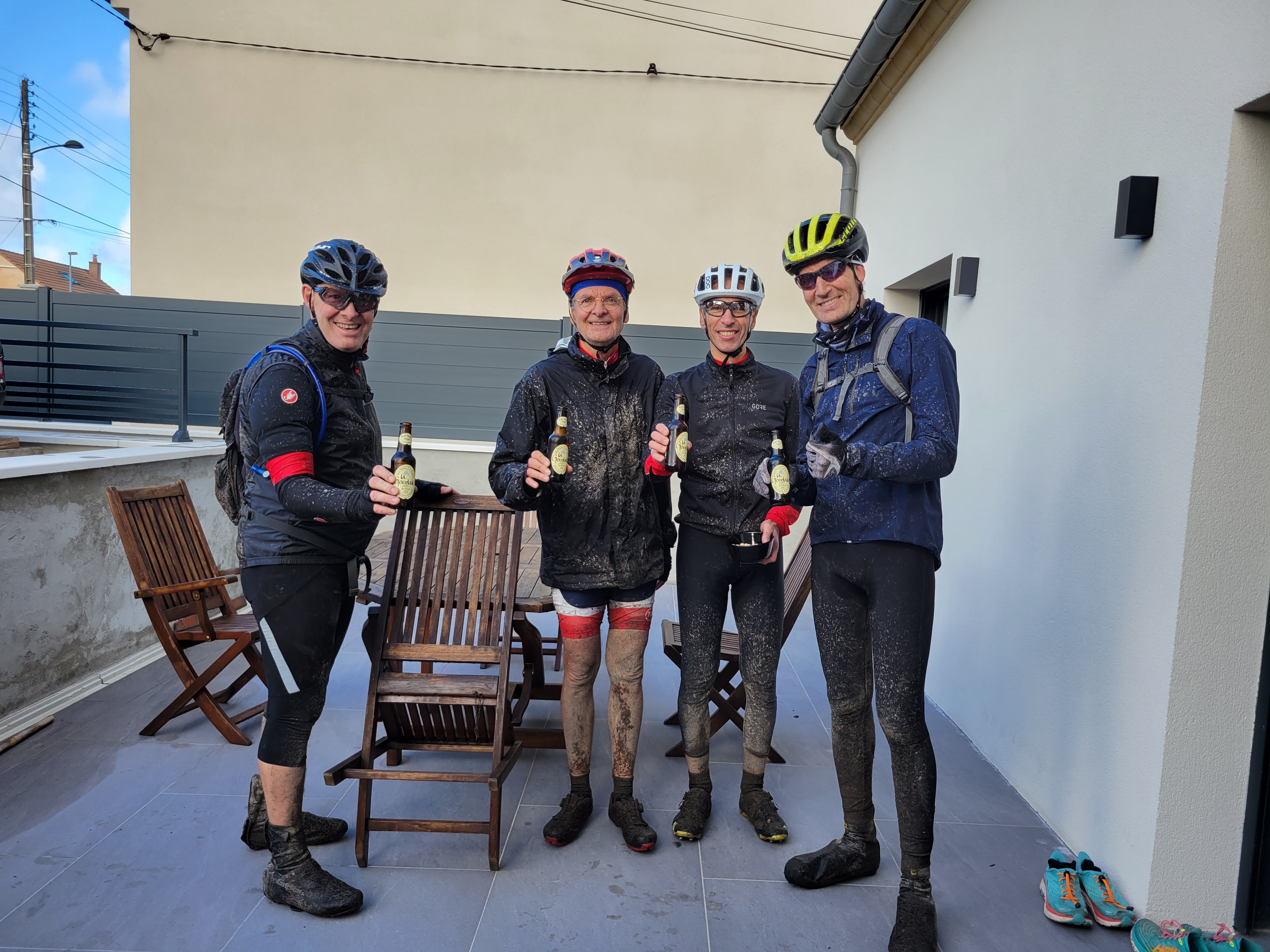 Un groupe A (Philippe G et Laurent), et un groupe B (Stéphane et Michel) au départ. Mais les premiers nommés ayant la bienveillance d'attendre les derniers (derniers également sur le terrain ...), nous restâmes ensemble tout au long de cette sortie, sur des traces nouvelles pour moi. Circuit très sympa, je termine avec 61 km et 730m D+ depuis la maison. Nous avons rencontré pendant une bonne demi-heure la 'rare averse' annoncée par la météo, et sommes rentrés bien mouillés et boueux, mais ça fait partie du fun des sports outdoor ...
