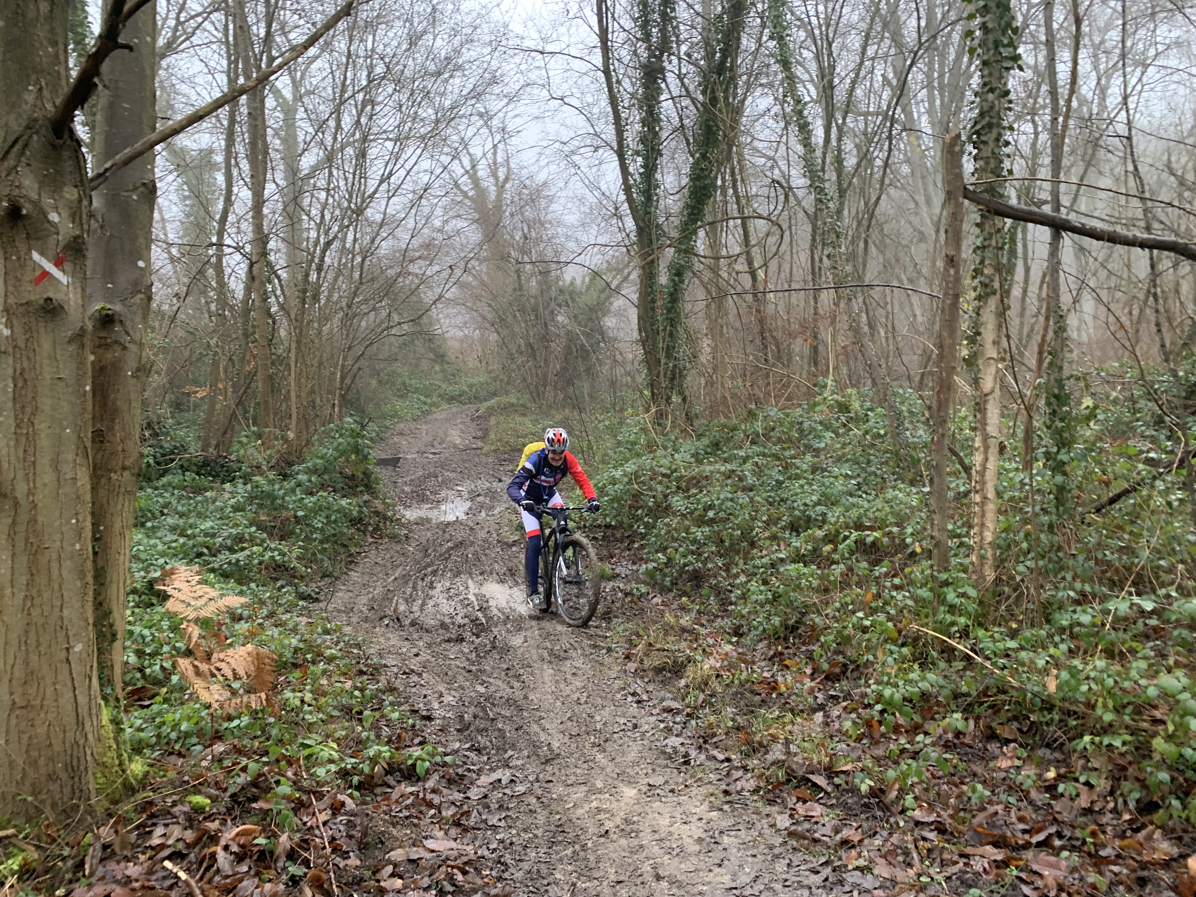 Quelques passages bien boueux (la photo l'illustre assez bien ...), mais sur de courtes distances (enfin c'est ce qui était annoncé à l'entrée du single au dessus de Crespières). De la brume rendant le paysage mystérieux, et nous obligeant à faire attention aux panneaux qui circulent