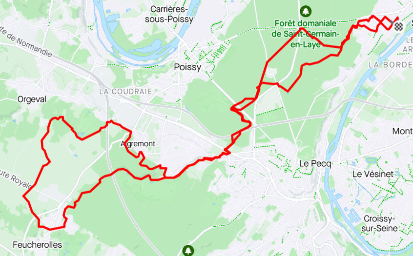 Direction Aigremont, la ferme du Poult, les chemins dans les champs jusqu'à Feucherolles, et retour classique pour cette sortie de 45 km et 400 m D+, faite sous un ciel gris et un temps frais mais sec, avec Dominique, Bernard, Benjamin, Régis, Vincent D, Emmanuelle, Benoît, Michel. Pas de chute, pas de problème mécanique, la condition de chacun au top, donc tout va bien.