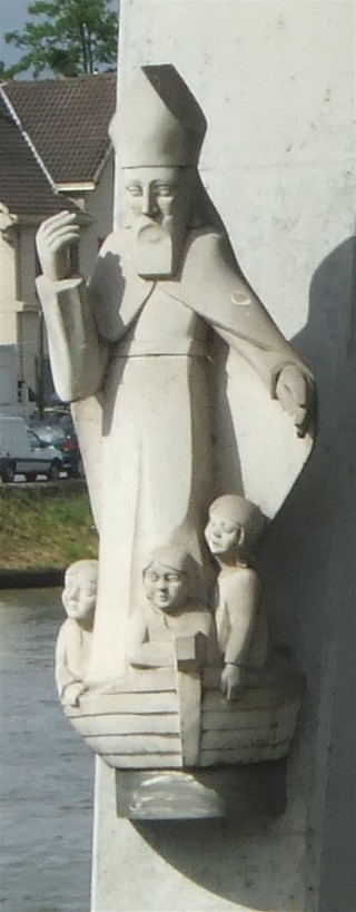 Construite en 1985 Sur demande du service de la navigation de la Seine et afin de relier le quartier de l'île au Bac, l'architecte Philippe Fraleu avance différentes propositions. En définitive, la passerelle est construite à vingt mètres en amont du pont de Conflans et parallèle à son axe. Elle comporte deux « observatoires » vers l'amont en direction du vieux Conflans. En juin 1986, la statue de saint Nicolas a été placée contre la première pile de la rive droite en regardant vers l'aval. Le saint est représenté bénissant trois enfants placés à l'avant d'une barque et non pas dans le saloir.