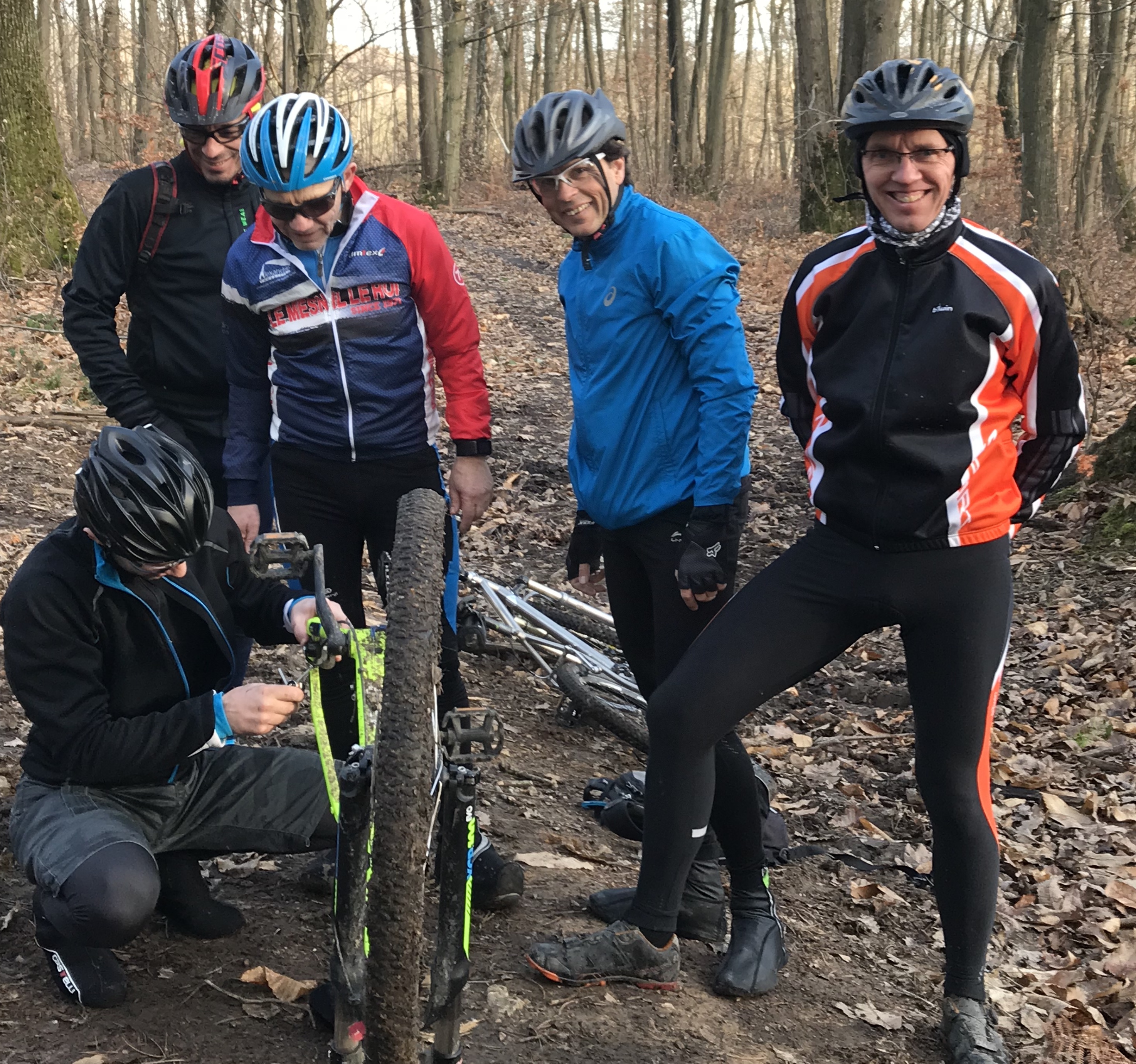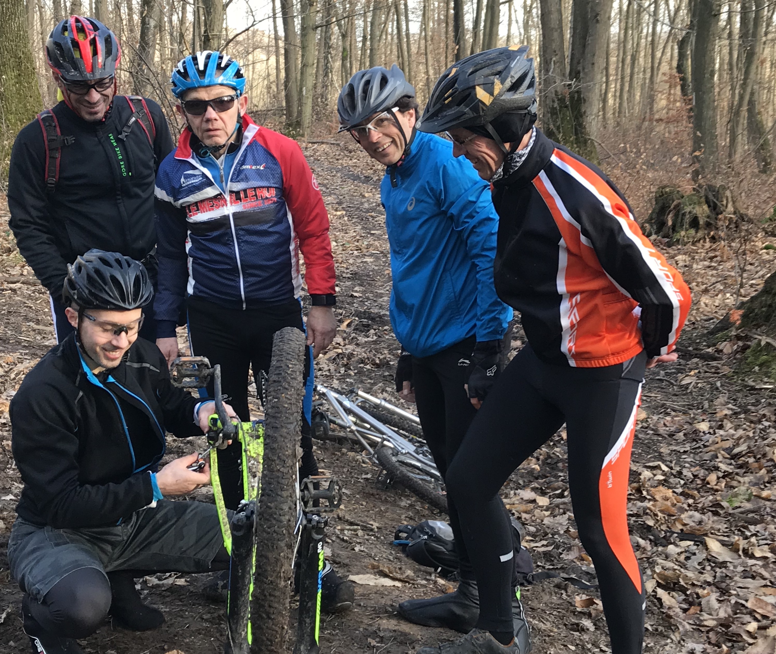En fait, Muriel avait tout simplement eu la bonne idée de rouler avec son frein à disque arrière réglé trop serré, donc gros gros frottement de la plaquette en permanence. D'où les gouttes de sueur qui perlaient sur son front, même sur terrain plat, et je ne vous parle pas des montées ...