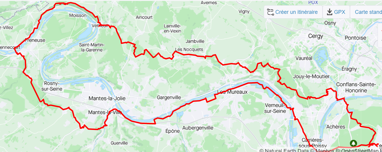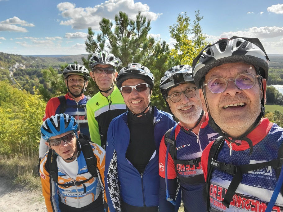 Les pénuries d'essence ayant bloqué Marc à la pompe (certains le soupçonnant d'être resté sous la couette ...), nous partons à 6 du Mesnil (Dom, Emmanuelle, Serge, Régis, Jocelyn, Michel), afin de rejoindre Marc à Maurecourt, au pied de l'Hautil. Nous poursuivons à 7, avec une traversée de l'Hautil par quelques chemins guère praticables à cause d'arbres couchés, ou nous perdons Marc pendant quelques km, avant de le retrouver quelques km plus loin. Nous évitons d'être pris pour des sangliers lors d'une chasse bien sonore avec beaucoup de chasseurs perchés sur leur poste de gué. Nous arrivons vivants et affamés à Vétheuil, pour la pause déjeuner, où Emmanuelle prend la tangente, après un bel effort de 53 km et 850m D+. Nous poursuivons donc à 6 vers notre destination de la Roche Guyon, après une montée à 23% (pour l'essentiel faite à pied ...), et un single sur la Corniche. Pause café à La Roche Guyon, sous un beau soleil, et rejoints par Emmanuelle et Benoit. Le nombre de km restant et les jours raccourcissant, nous poursuivons à un bon rythme vers le pont permettant de rejoindre la rive gauche de la Seine à Bonnières. Nous traversons la forêt de Rosny, avant de longer la Seine de Mantes-la-ville à Triel. Une crevaison pour Régis, permettant à Marc de montrer son expertise en mèche pour pneus tubless. La nuit arrivant, nous faisons 2 groupes à Triel, Dom, Jocelyn et Régis devant, Marc, Serge et Michel derrière. Serge devant trainer les 20 kg de sa monture pour les 20 derniers km suite à l'épuisement de sa batterie. Nous laissons Marc à Carrières-sous-Poissy afin qu'il puisse rejoindre Maurecourt par les bords de Seine, nos terminons Serge et moi de Poissy à ML sans éclairage à la lumière des voitures nous doublant. Belle expérience, superbe journée d'octobre, bonne ambiance, et bien lessivés à l'arrivée pour certains d'entre nous ... Je termine à 134 km (donc 130 km du club au club), mon record perso battu de 6 km, mais avec un D+ bien supérieur de 1616 m. Voici la trace Strava, et les participants moins Emma qui nous à quitté un peu avant :