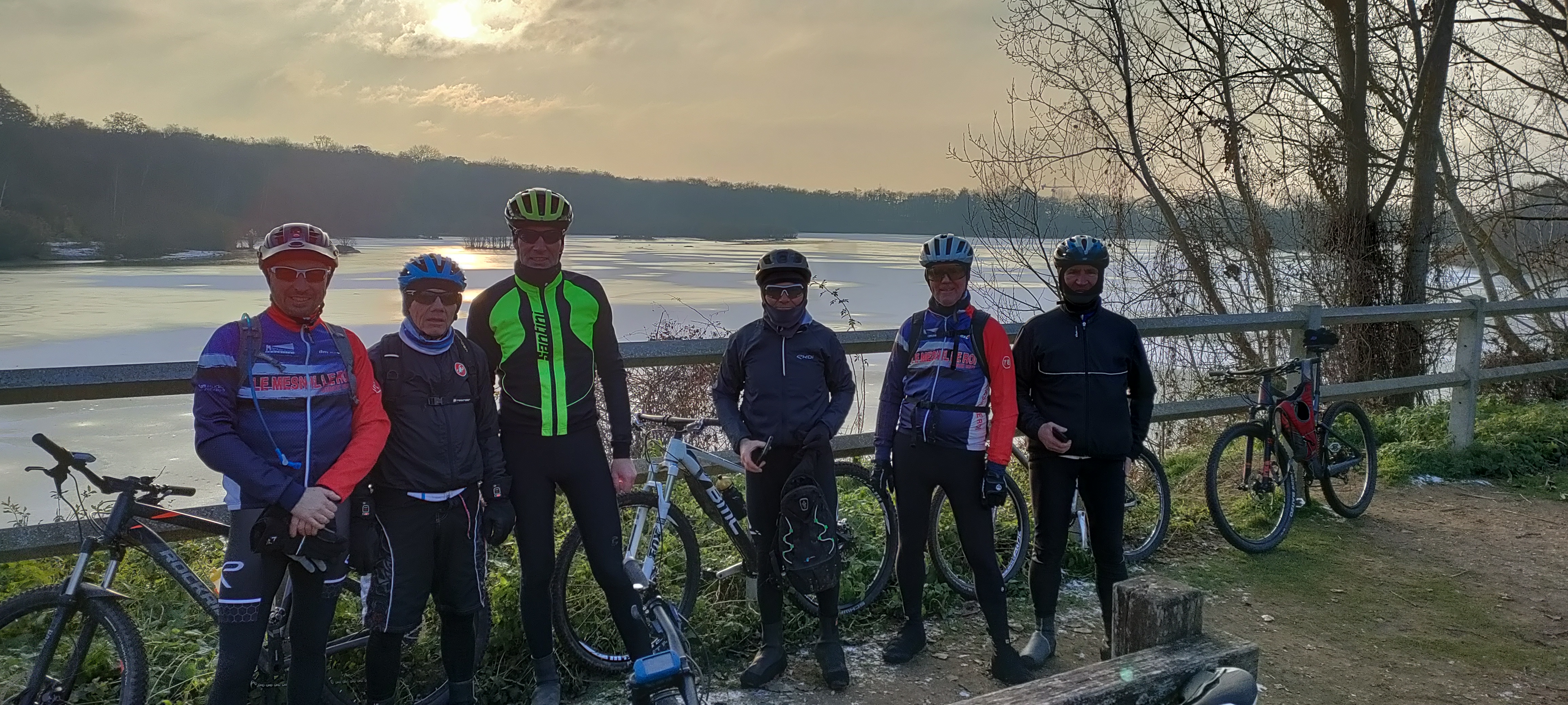 Est-ce le froid mordant ou les emplettes de Noël à terminer qui ont rebuté les participants ? Toujours est-il que nous étions peu nombreux au départ : Dom, Thierry, Laurent, Regis et Jean. Nous rapprochant des journées les plus courtes de l'année, nous avons choisi un parcours qui ne soit pas trop long : le tour de la forêt de Saint-Germain en Laye, dans le sens horaire, à savoir Saint-Germain, Chambourcy, Poissy, étangs du Corra et retour par le single. Nous avons bénéficié pendant notre sortie du soleil et du ciel bleu, ce qui a atténué les basses températures. Sur le chemin du retour, nous avons récupéré Serge qui avait raté le départ, et nous avons fait une courte pause pour immortaliser les étangs du Corra pris par le gel sur notre photo de groupe.