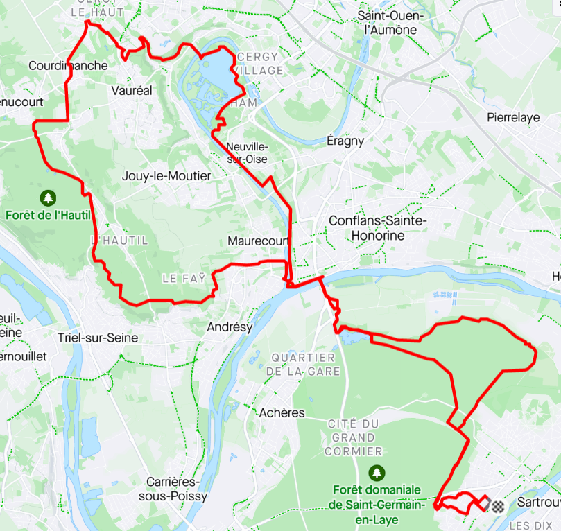 Groupe fourni de 15 personnes direction Cergy, Courdimanche, et retour par l'Hautil : Thierry, Dominique, Régis, Bernard, Benjamin, Bruno, Jean, Sandrine, Emmanuelle, Benoît, Benoît B, Olivier, Vincent L, Philippe D, Michel.