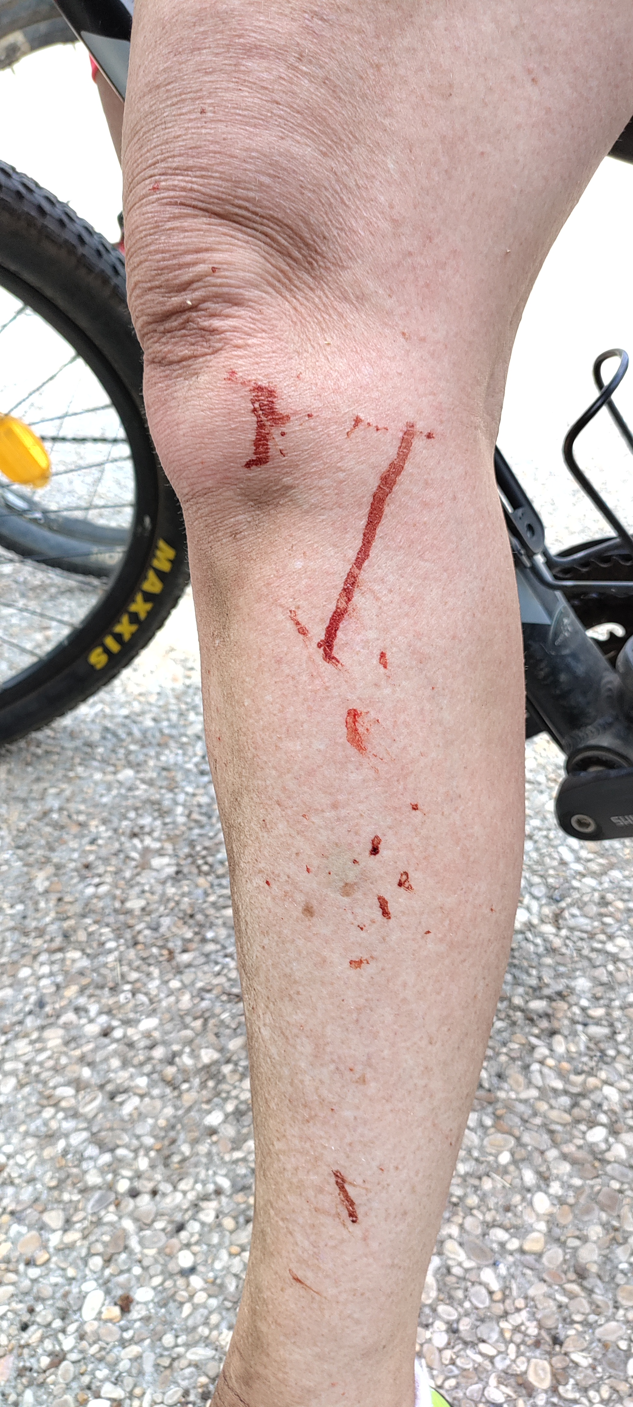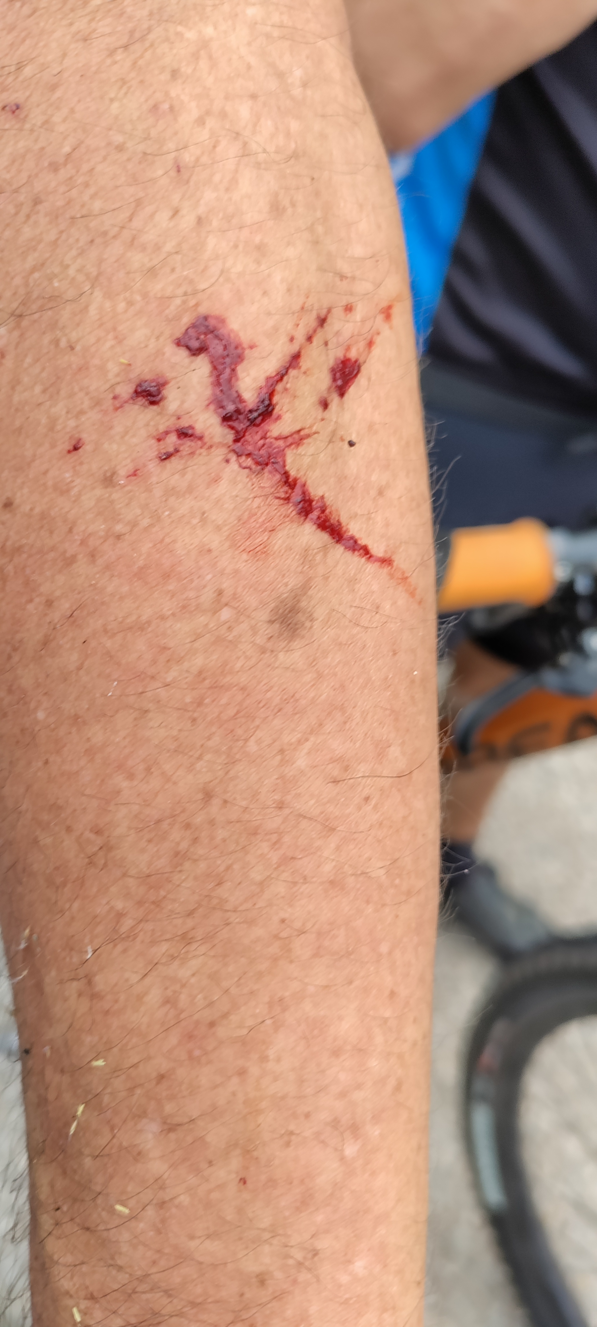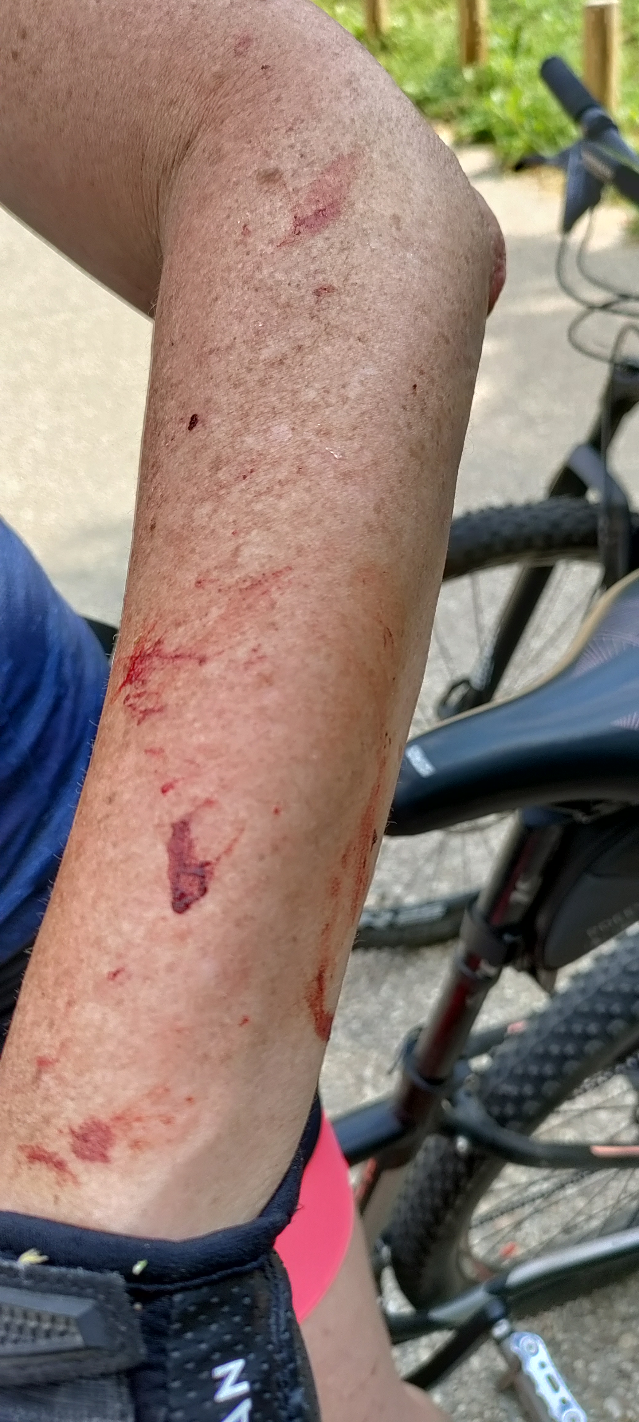Plus de 30° degrés étaient prévus pour l'après-midi. Les 9 présents (Emmanuelle, Sandrine, Benoit, Benoit, Bernard, Bruno, Philippe, Vincent et moi) exigent donc un parcours à l'ombre ! Je propose donc le grand tour de la forêt de Saint-Germain en Laye. Parcours classique : le single vers les étangs du Corra, remontée vers la gare d'Achères Grand Cormier, puis on longe dans la forèt la voie ferrée pour emprunter la route et passer de l'autre côté. Et là, petite nouveauté, nous empruntons un joli single en lisière de la forêt. Et ce fut sanglant (voir photos) ! Après les pluies puis le grand soleil, ronces et orties s'en sont données à coeur joie pour érafler et égratigner mollets et avant-bras. Egalement, mea culpa, un peu trop d'innovation dans le choix des chemins nous a emmené vers des passages en friche. L'innovation ne va sans risques !!!