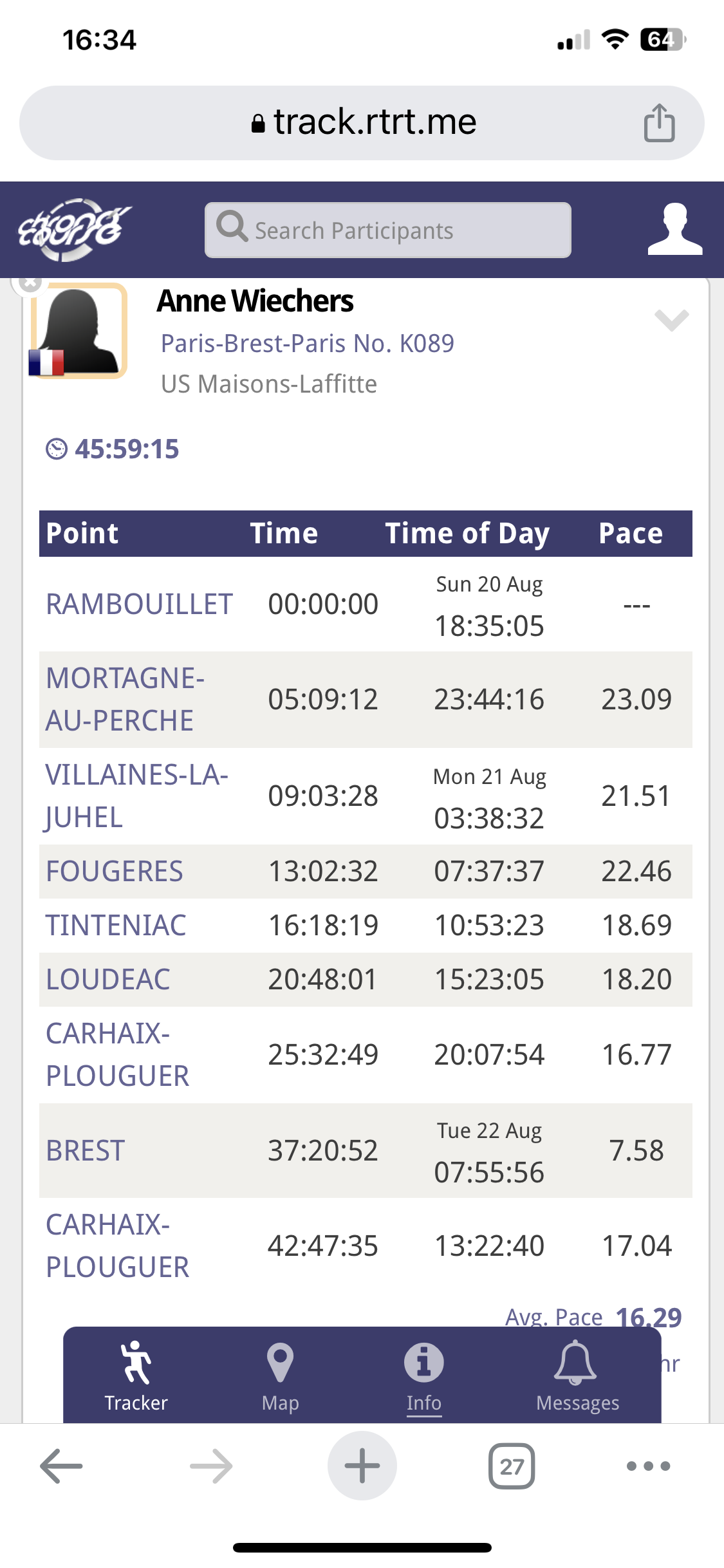 Bravo à Jocelyn qui est arrivé à Brest vers 15 h 50 avec un temps cumulé de 34 h 30 (37 h pour Anne et Nick)