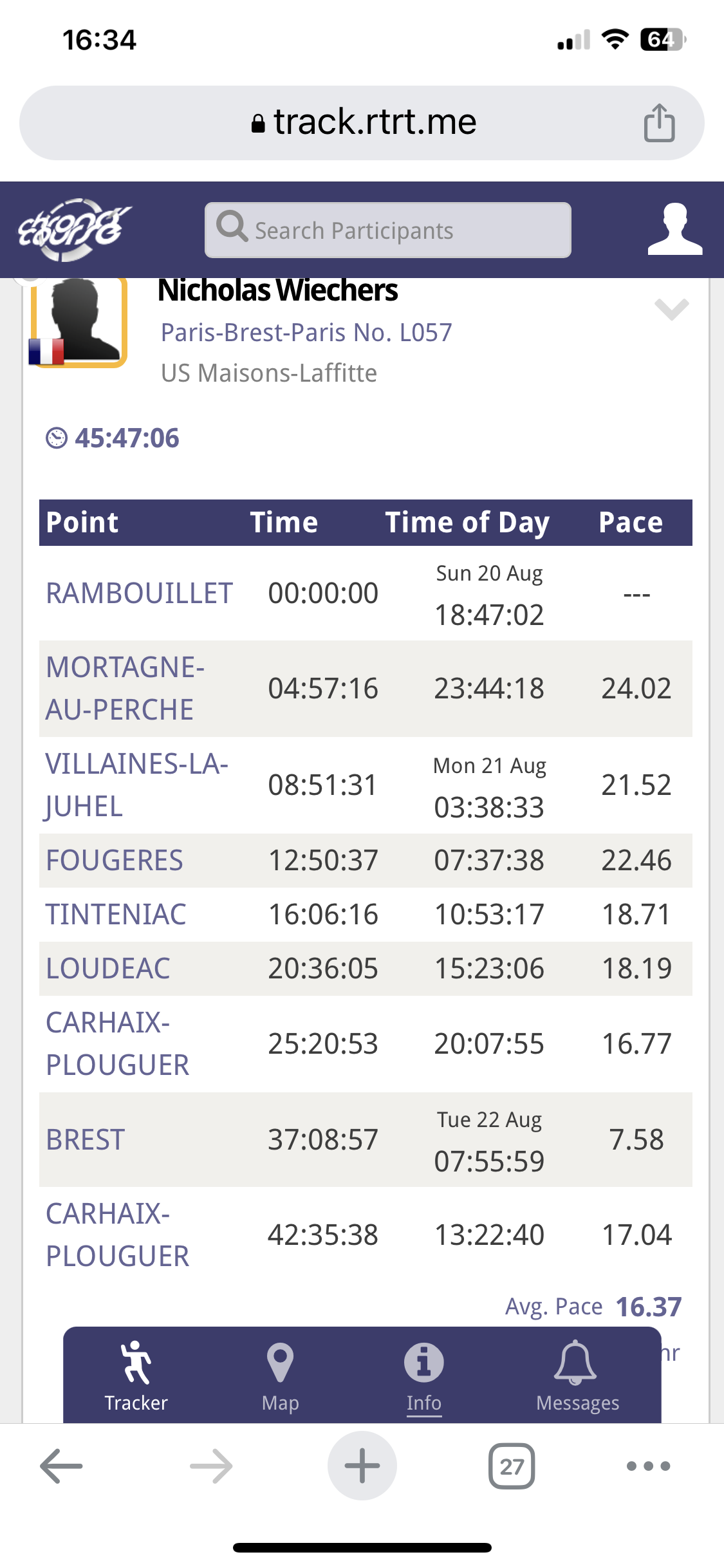Jocelyn est arrivé à l'avant dernier pointage à Vilaines la Juhel à 20 h 15. Il lui reste environ 200 kms. Il doit arriver demain avant 17 h pour tenir le délai de 84 h de sa catégorie.