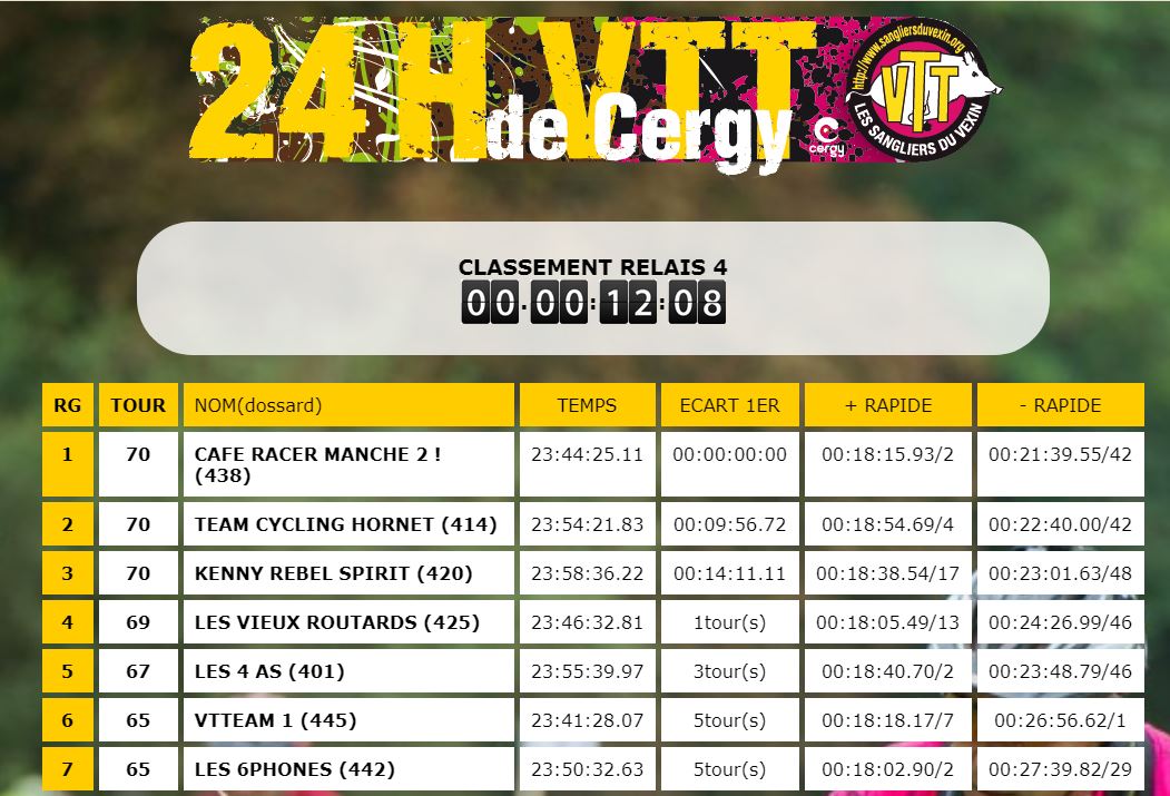 Vous pouvez suivre le classement en direct en allant sur le lien suivant : http://www.24heuresvttcergy.fr/classement-2018/live