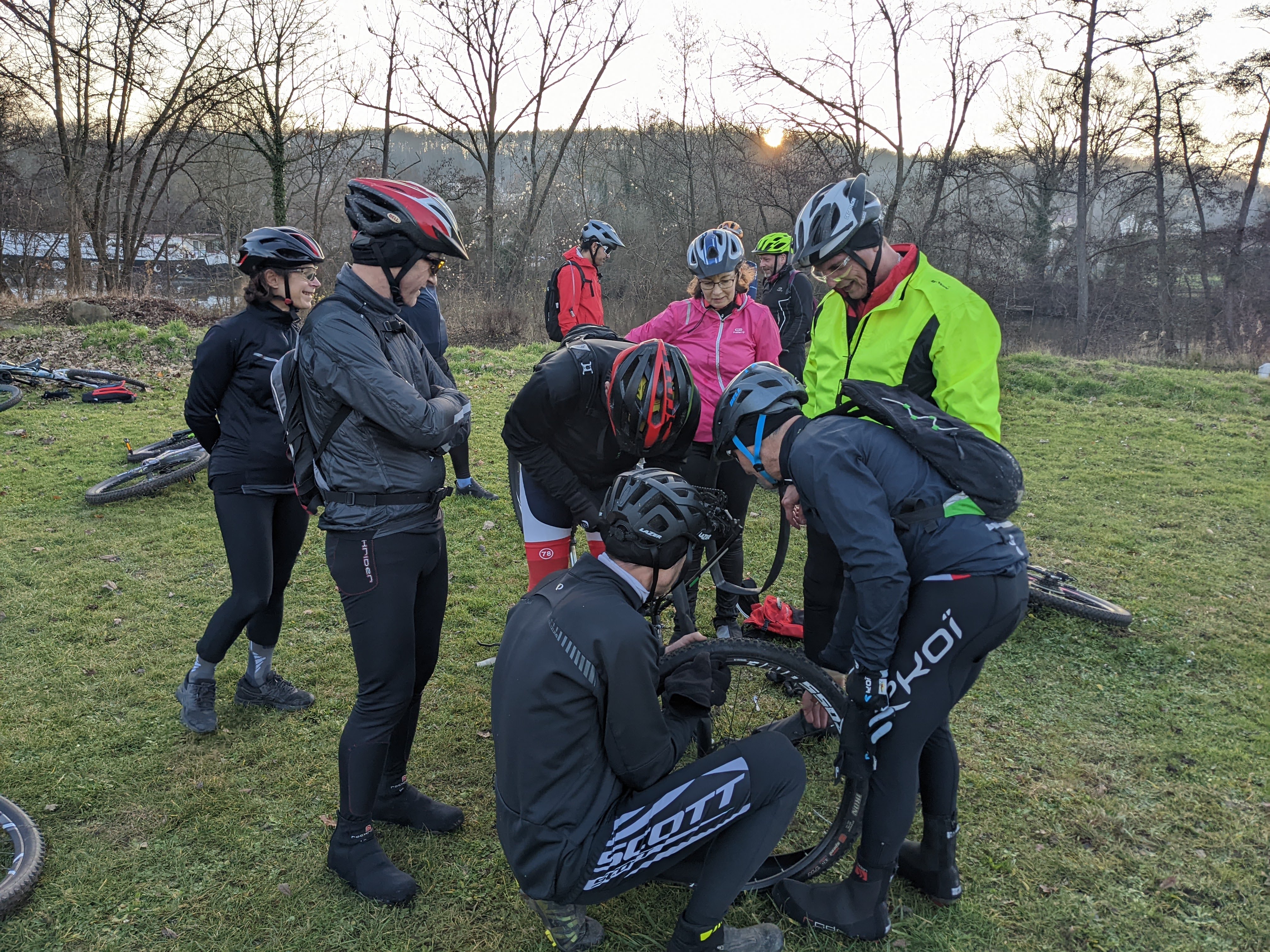 De retour aux étangs de Cergy, Benoit a crevé ce qui a obligé les mécanos à changer sa chambre à air. Pendant ce temps, certains en ont profité pour souffler un peu et reprendre des forces et d'autres "increvables" se sont amusés à gravir la butte au pied de laquelle nous étions arrêtés.