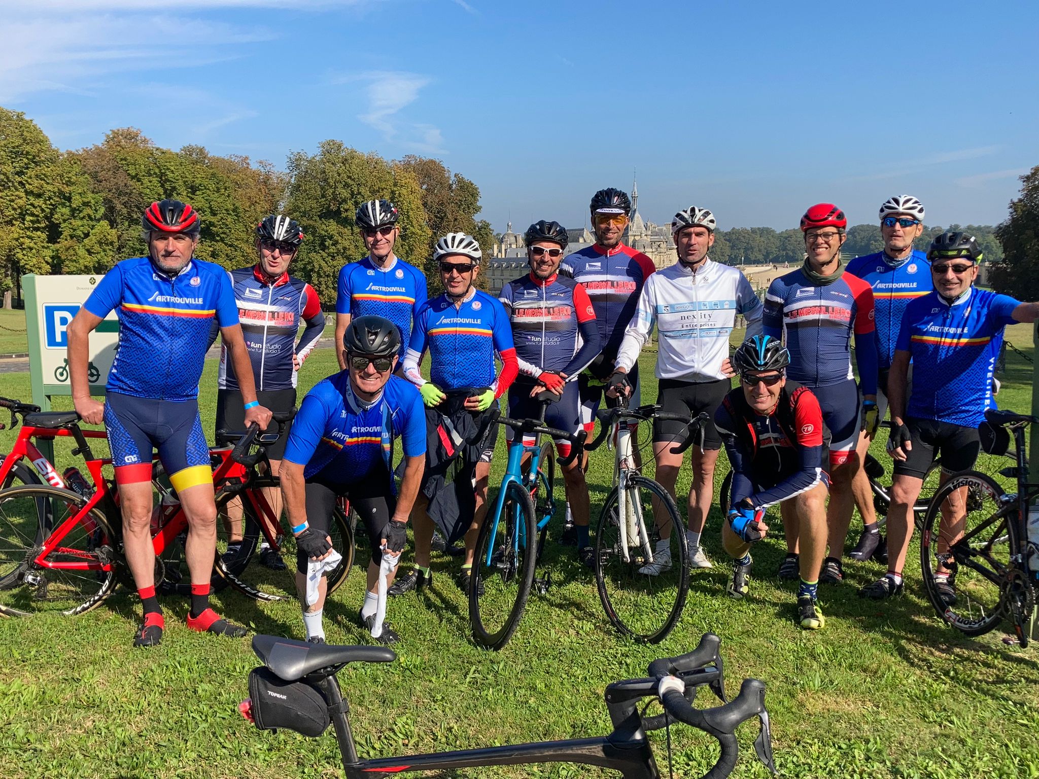 Le soleil est finalement arrivé après le premier ravitaillement à Haravillers et notre beau peloton a continué sans incidents jusqu' à Chantilly. Après le repas et la photo habituelle devant le Chateau, notre peloton s'est agrandi avec un cycliste de Chatou et trois de Noisy/Bailly.